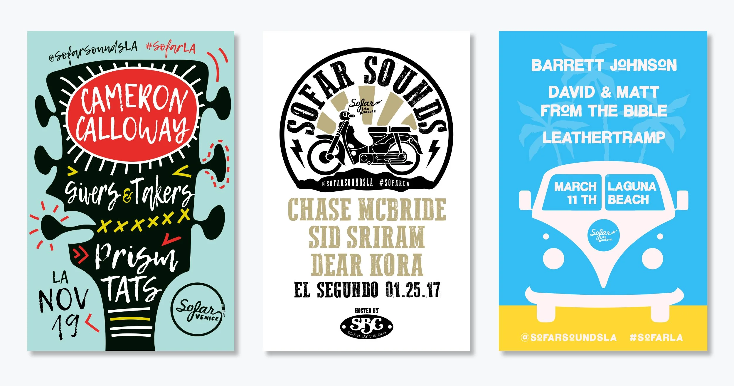 The intersection of music and design has always been one of my favorite spaces to explore, so I was thrilled to work on concert posters for Sofar Sounds, a global community that brings artists & audiences together to create intimate, live performances in unique, secret spaces.